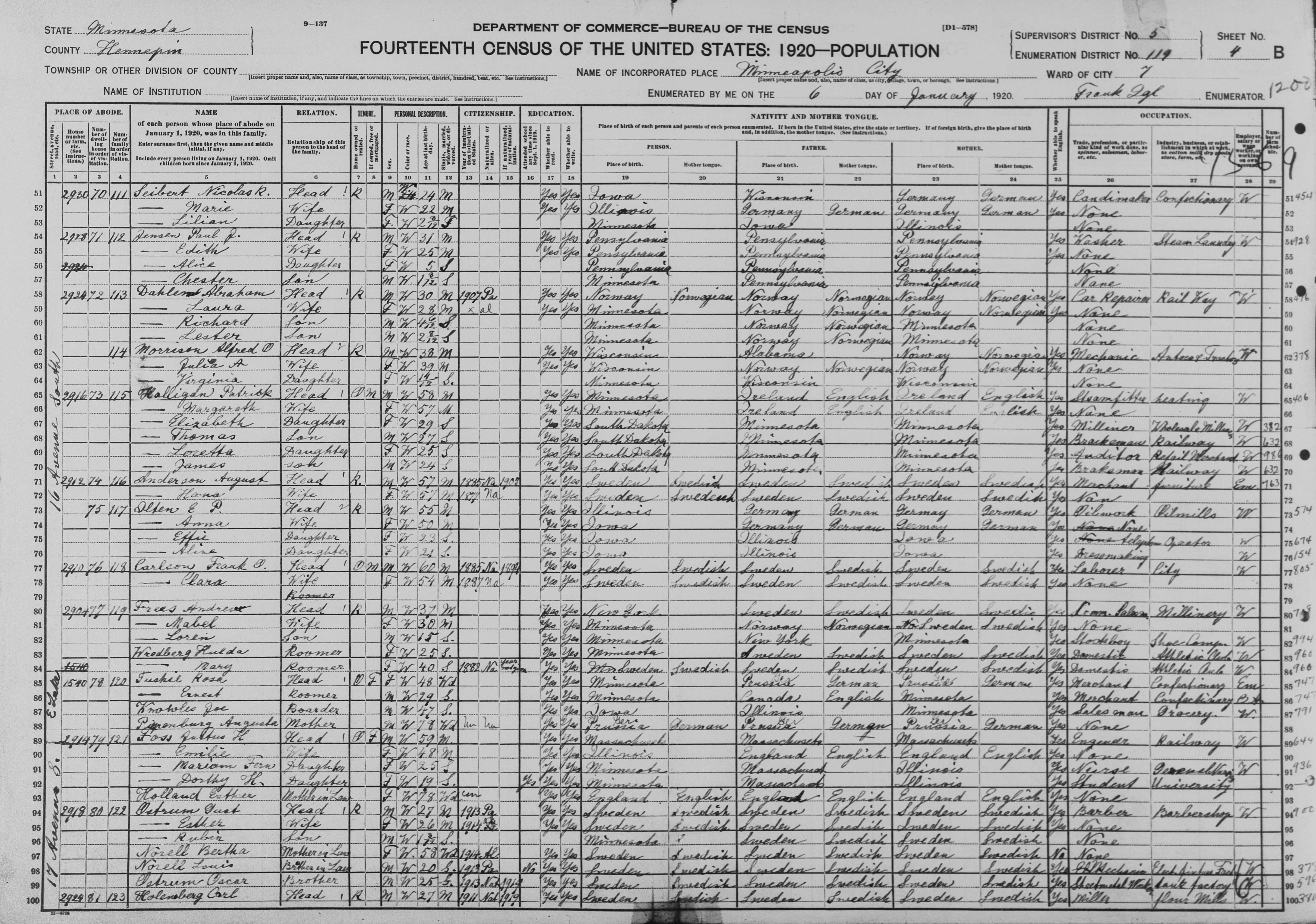 - Andrew (37) and Mabel (30) are listed on the 1920 Census living in Minneapolis, Hennepin, Minnesota. Loren (15) is listed as living with them. Andrew is listed as working in the millinery industry. No occupation is listed for Mabel. Documentation #39: ‘Minneapolis, Hennepin, Minnesota, Census, 1920, Line 80-82’