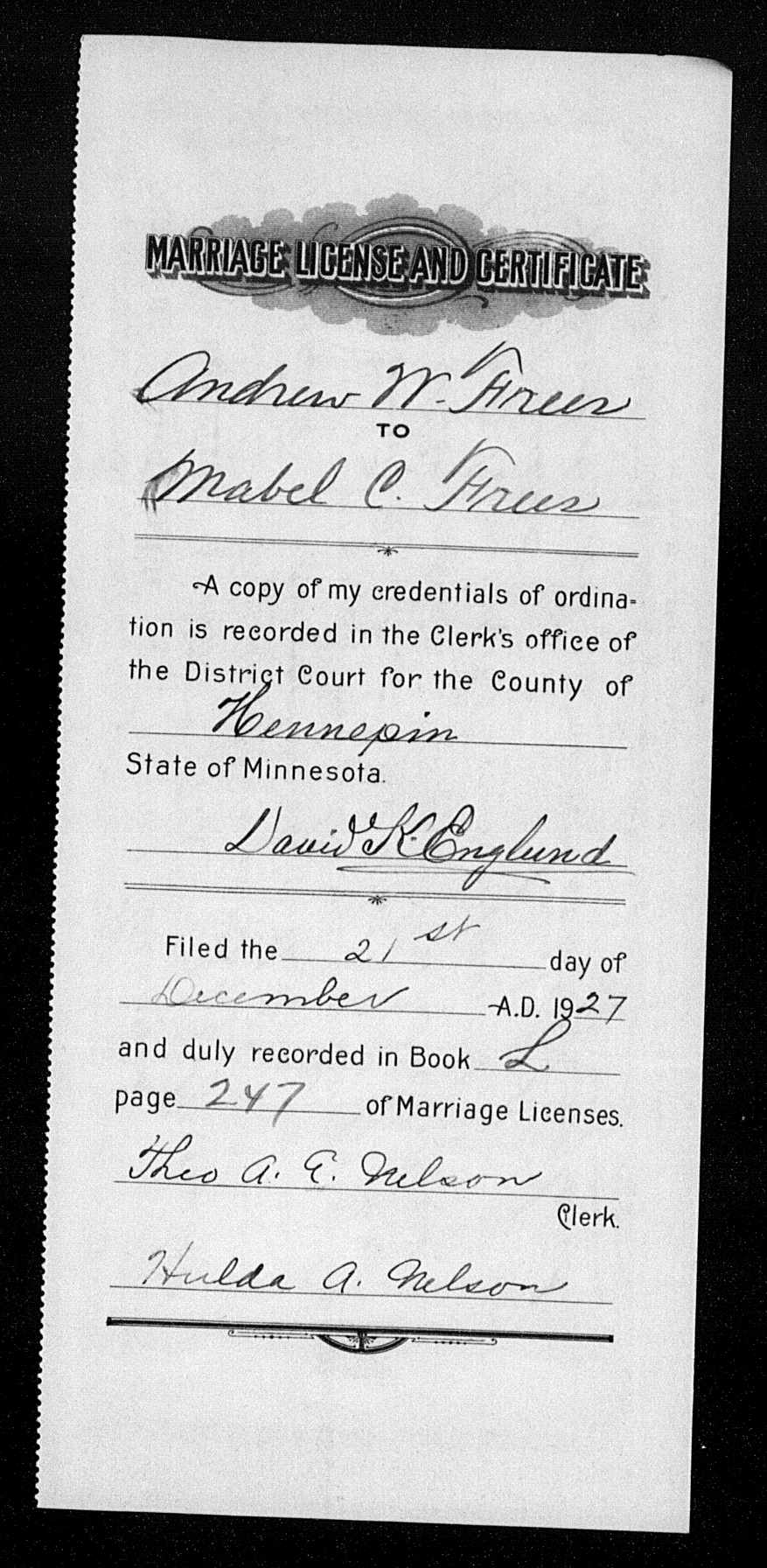 16 Dec 1927 Andrew (45) and Mabel (38) are married in Anoka, Minnesota. Documentation #46: Minneapolis, Hennepin, Minnesota, Marriage Certificate; Documentation #47: ‘Minneapolis, Hennepin, Minnesota, Marriage License and Certificate‘